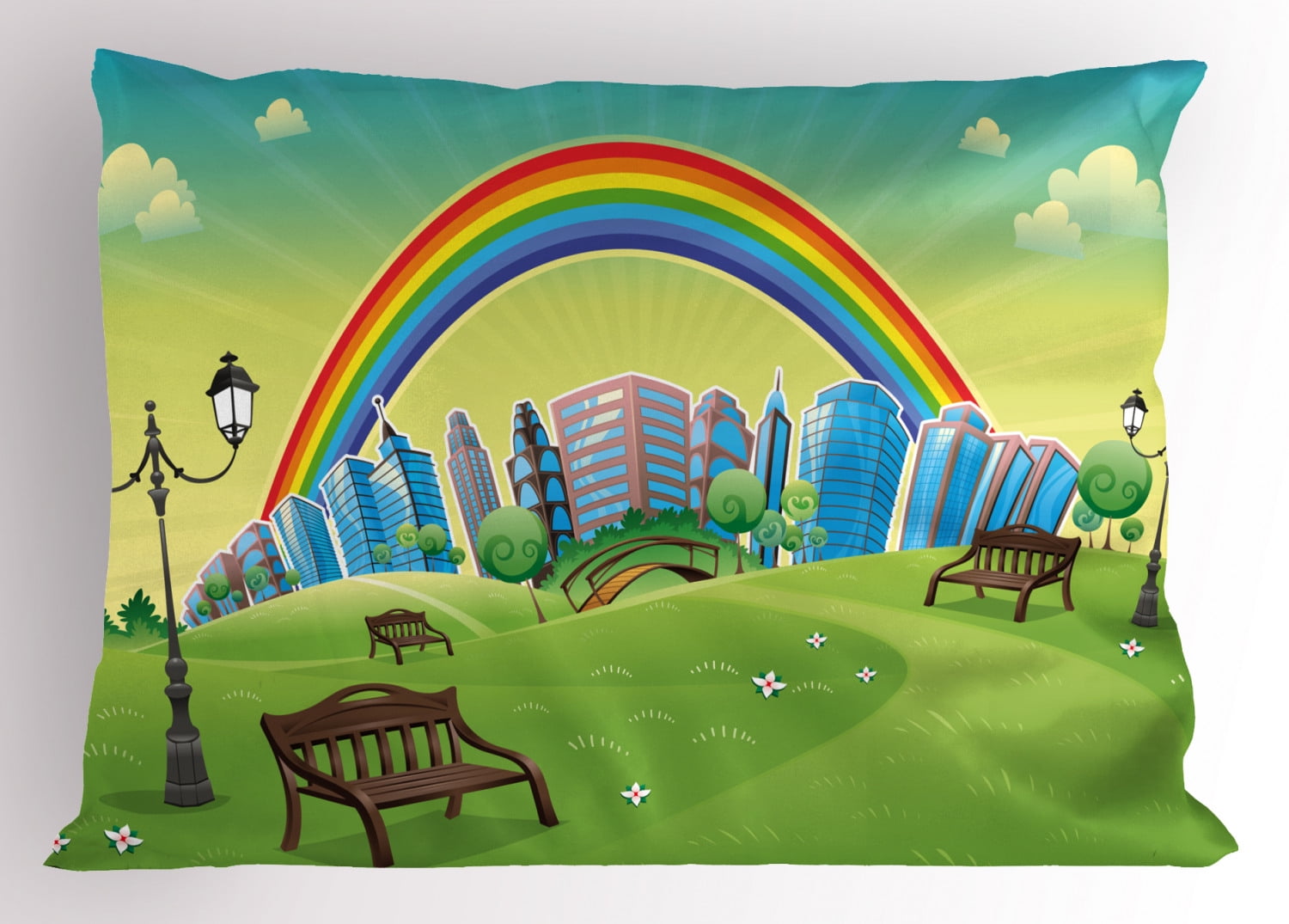 Cartoon Pillow Sham Kids Nursery Design Park Bench Hills