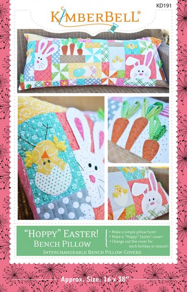 The hoppy easter bench pillow features pieced and appliqued blocks with darling dimensional elements. Kimberbell designs limits the number of items made for resale to 200 from a single design or pattern. Peek a boo bunnies and downy chicks join the parade of pretty pastels for kimberbells newest release in their popular bench pillow series.